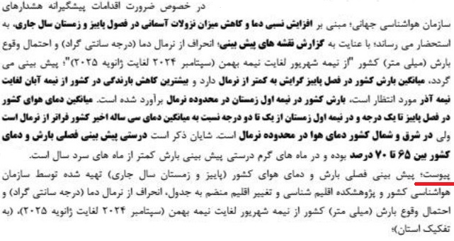 جهت مشاهده پیش بینی فصلی بارش و دمای هوای کشور، همراه با توضیحات کامل و نقشه، اینجا را کلیک نمایید