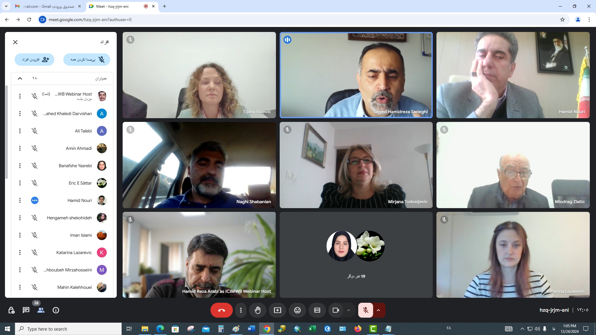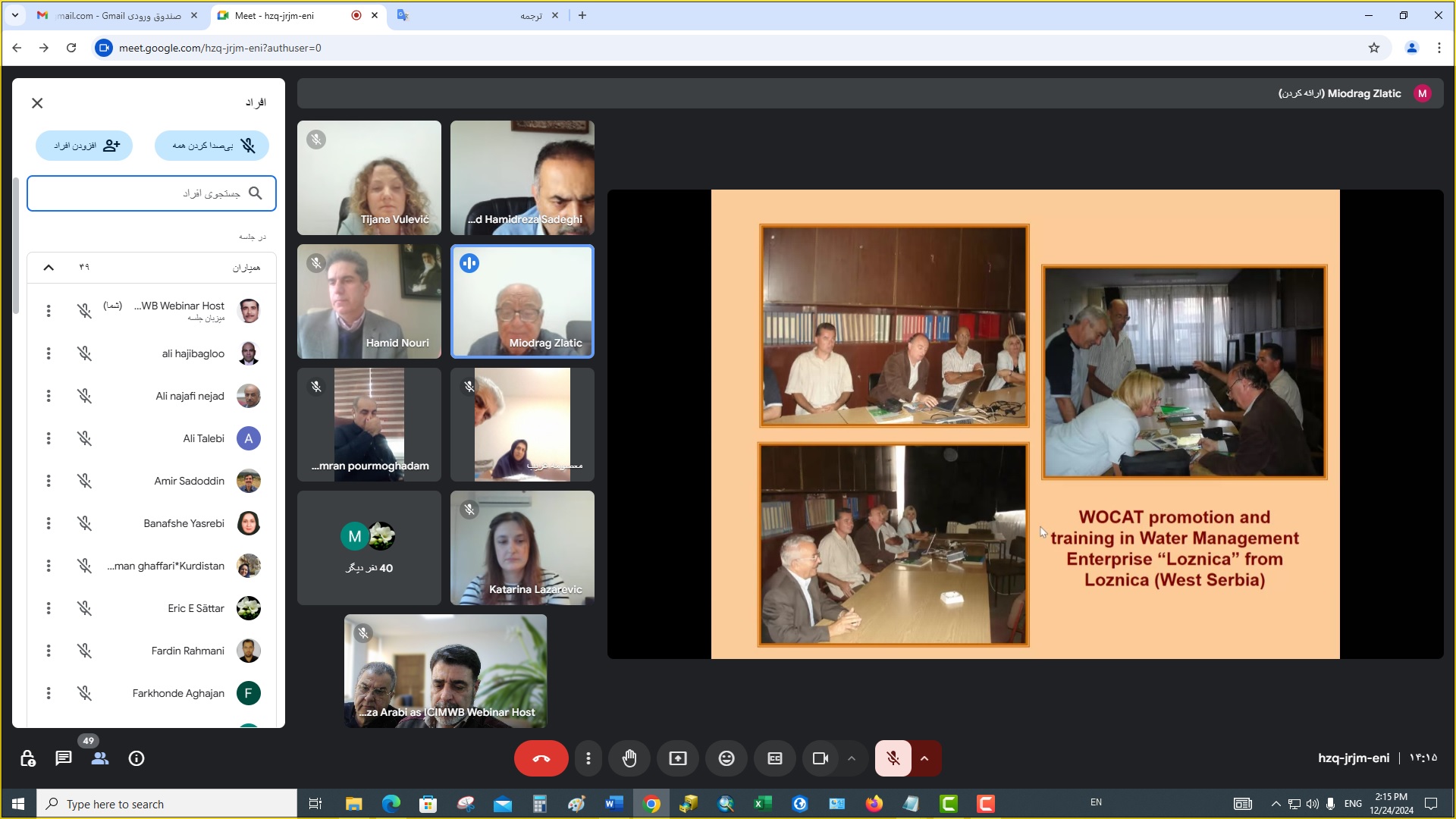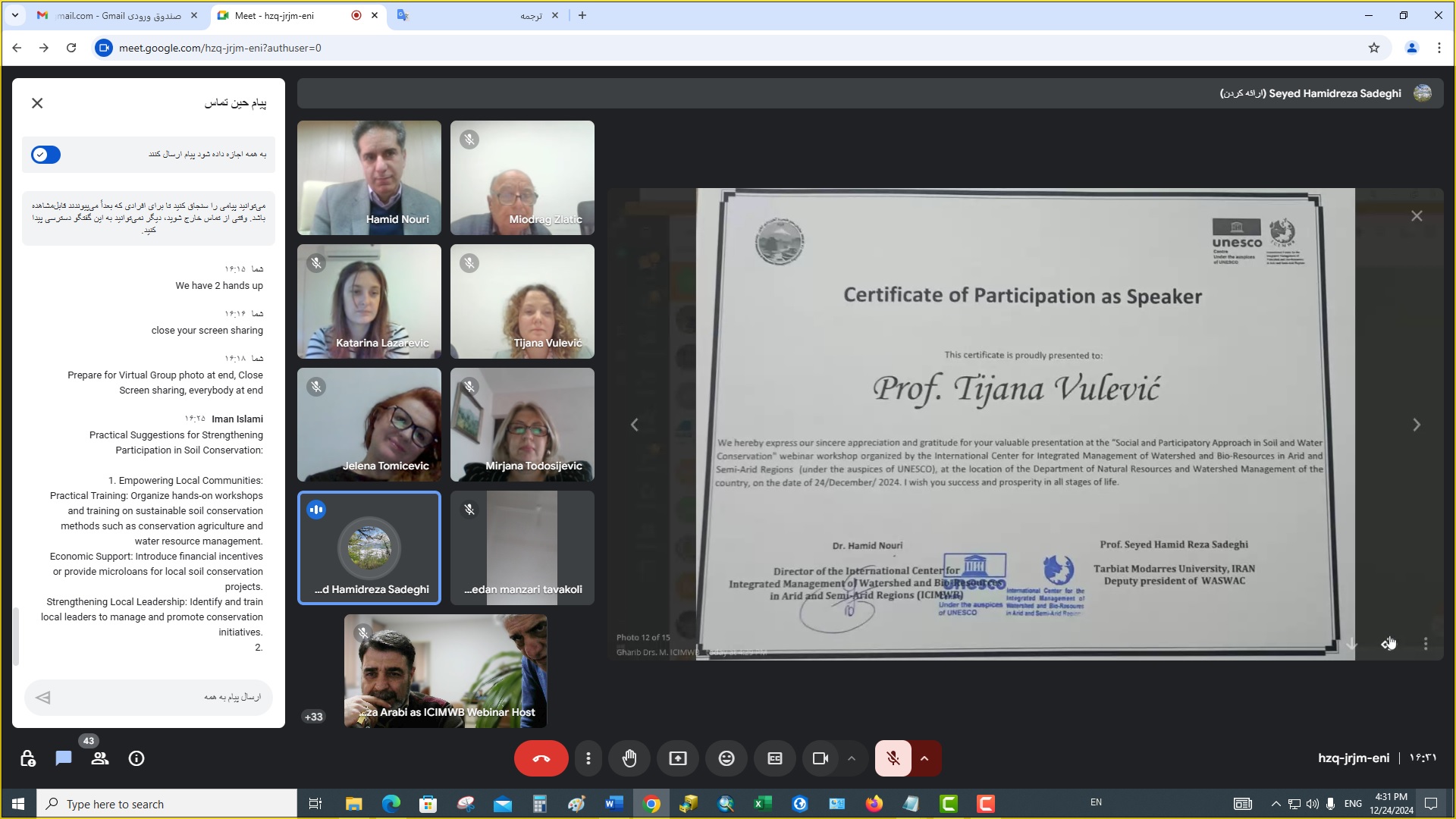 برگزاری سمینارها، وبینارها، نشستهای علمی و کنفرانسهای بینالمللی از مهمترین برنامههای مصوب شورای حکام مرکز بینالمللی مدیریت جامع حوزه آبخیز و منابع زیستی تحت پوشش یونسکو (ICIMWB) در سال 2024 است. به همین منظور در سالروز گرامیداشت پروفسور دکتر کریم ساعی بنیانگذار علوم جنگل کشور،وبیناری علمی به میزبانی مرکز بینالمللی ICIMWBو سازمان منابع طبیعی و آبخیزداری کشور، با مشارکت برخی از اساتید دانشگاه بلگراد، انجمن جهانی حفاظت از آب وخاک (WASWAC)، دانشگاه تربیت مدرس، دانشگاه علوم کشاورزی و منابع طبیعی گرگان و انجمن آبخیزداری ایران در 24 دسامبر 2024 (4 دی 1403) از ساعت 13 تا 16:30 برگزار گردید. در این وبینار حدود 77 نفر از اساتید، کارشناسان، محققان داخلی و خارجی حضور داشتند. لیست اساتید و عنوان سخنرانی ها به شرح جدول زیر میباشد: